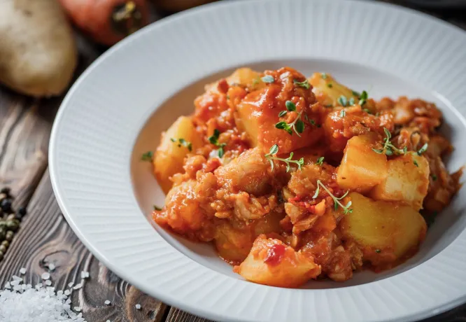 Тушкований хек з картоплею та томатами від Євгена Клопотенка